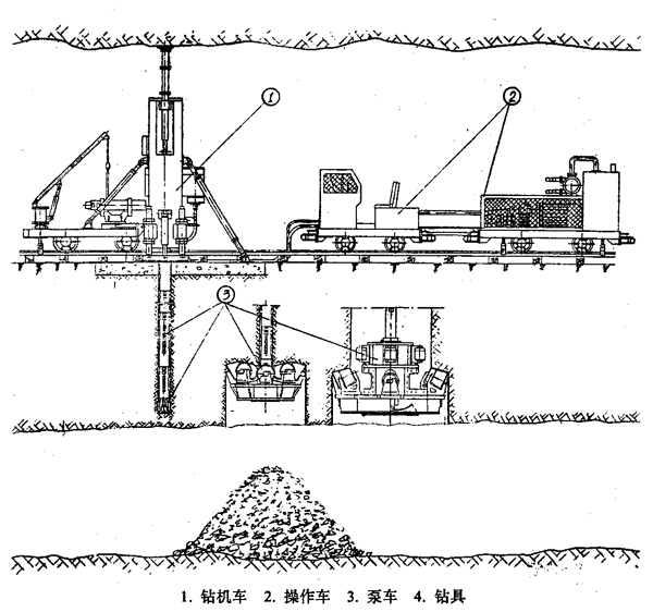 1、硐室要求:在豎井上水平面硐室凈寬度不得低于4米,高度3.5米至4米,硐室內(nèi)并平整場地,并敷設(shè)雙軌循環(huán)車場,循環(huán)車場長度不低于20米,鉆孔中心準(zhǔn)備兩節(jié)可以取出的長度為2.5米的短鋼軌,用于大鉆頭的取出。要求場地能滿足鉆機(jī)基礎(chǔ)及泥漿循環(huán)池施工和反井鉆機(jī)運行的需要;